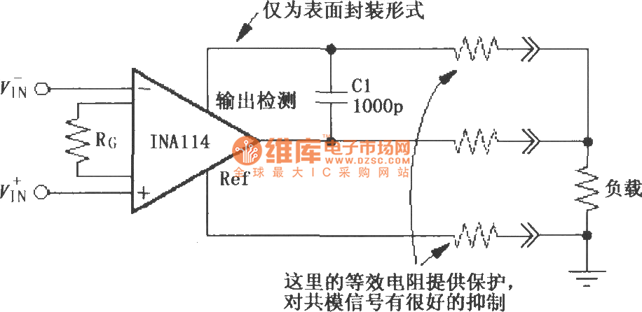 大器在实际应用中所涉及到的这些问题分别加以阐述。2 仪表放大器的结构 仪表放大器一般是由三个放大器和经过激光调阻修正的电阻网络构成,如图1所示。在传统的三片运放方式的基础上做一些改进,内部阻值的校准保证用户只需要外接一个电阻即可实现由1到上万倍的增益精确设定,减少了由于增益相关误差带来的数据采集误差,同时这种结构保证其具有高输入阻抗和低输出阻抗,且每一路输入都有输入保护电路以避免损坏器件。由于采用激光调阻,使其具有低失调电压、高共模抑制比和低温漂。 图1所示为bb(burr brown)公司的ina114、ina118等仪表放大器的结构原理框图及引脚。在实际应用时,正负电源引脚处应接滤波电容c,以消除电源带来的干扰。5脚为输出参考端,一般接地。实际应用中即使5脚对地之间存在很小的电阻值,也将对器件的共模抑制比产生很大的影响,如5欧姆的阻值将导致共模抑制比衰减到80db。3 应用中应考虑的问题3.1 输入偏置电流回路 一般来说,选择差分信号测量的工作方式时,后面的信号放大电路一般直接采用仪表放大器构成。仪表放大器的输入阻抗非常高,大约达到1010ω数量级,相应对于差分输入的每个输入端都需要输入偏置