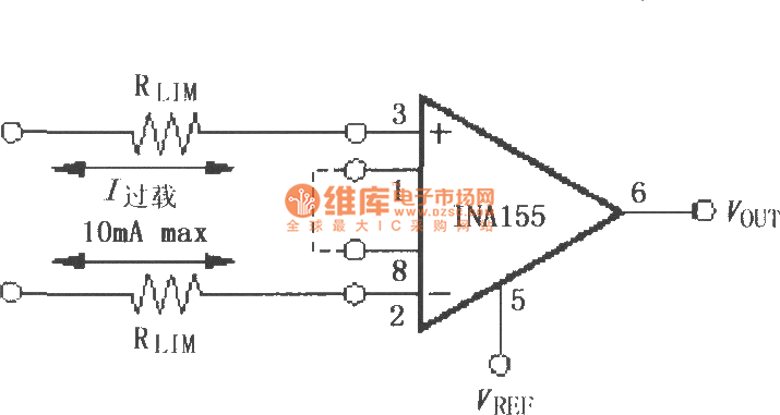 相关元件pdf下载:ina155 如图所示为由ina155/156构成的输入电流保护电路。ina155输入端内部具有静电放电(esd)保护二极管,当输入电压超过电源电压500mv时,保护二极管将导通,这时rlim将限制输入电流(最大10ma),起到保护电路作用。许多输入信号本身就有限流功能,这时限流电阻rlim可以不用。