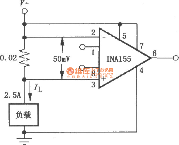 相关元件pdf下载:ina155 如图所示为由ina155/156构成用于检测负载电流大小的单电源高端电流监视器。在电源与负载之间串联一个取样电阻(0.02ω),负载电流流过取样电阻时产生电压降,电压降反映了负载电流的变化情况,将此取样电压输入ina155/156放大后输出。该电路增益为10,1、8脚之间不连接。