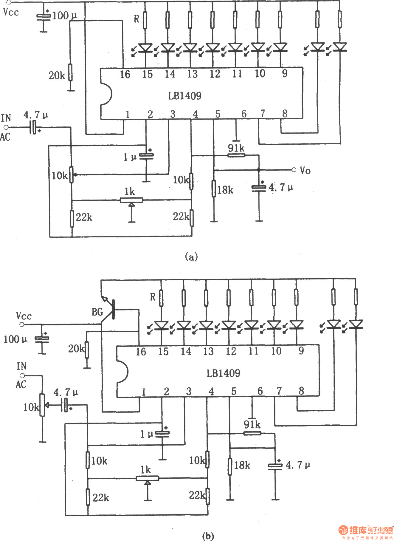 如图所示为LBl409九位LED电平显示驱动电路。图(a)是用LB1409做电平显示驱...