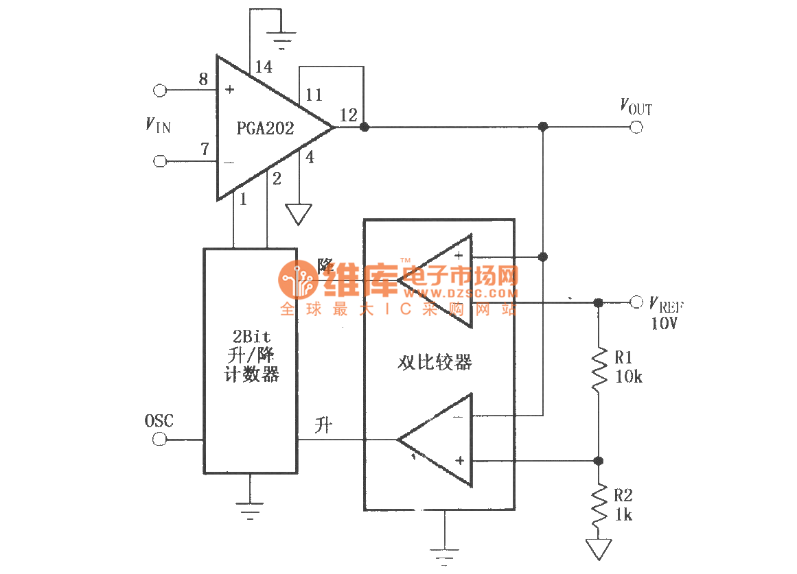 相关元件pdf下载:pga202 如图所示为由pga202与比较器、计数器构成的自动量程切换电路。该电路采用比较器在输出端与vout 进行比较,当vout >vref=10v时,比较器输出“降”信号,升/降计数器输出2bit编码pga202的a0、a1端,使pga202的增益下降;当vout <[1kω/(1kω+10kω)]×10v=0.909v时,比较器输出“升”信号,升/降计数器输出2bit编码到pga202的a0、a1端,使pga202的增益增大;当0.909v<vout<10v时,增益保持不变。