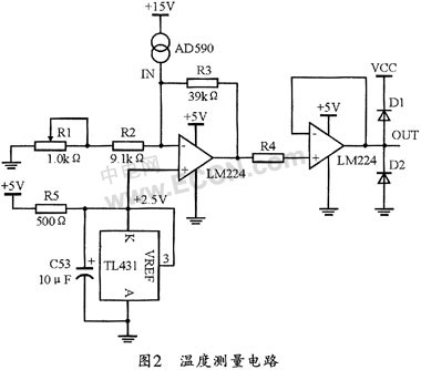 考虑到AD590温度传感器的输出电流源特性,设计的温度信号测量电路如图2所示。该电路的温度测量范围为-10~+500℃。AD590采用15V电压供电;电阻R1用于调整零点;电阻R3为精密电阻,用来调整增益。运放的同向端输入2.50V精密参考电压,该电压由TL431提供。IN端输入AD590的电流,OUT端输出为相应转换所得到的电压。根据AD590的特性,在-10℃时,流过电流为262.2μA,设计使这部分电流全部流过R1、R2,而其后增加的电流均流过R3,OUT端的输出电压为: