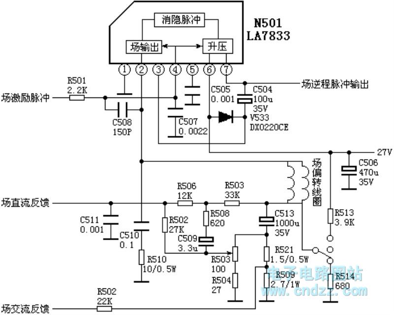 相关元件pdf下载:la7833 la7833/la7830是较常见的场扫描输出集成电路,一般用于25及25寸以下的彩电中。 1脚:0v——地2脚:15v——场输出端3脚:27v——泵电源输入端4脚:0.9v——场激励信号输入端5脚:0.8v——滤波6脚:27v——电源7脚:1.4v——外接升压电容imgload(document.getelementbyid("bodylabel"));