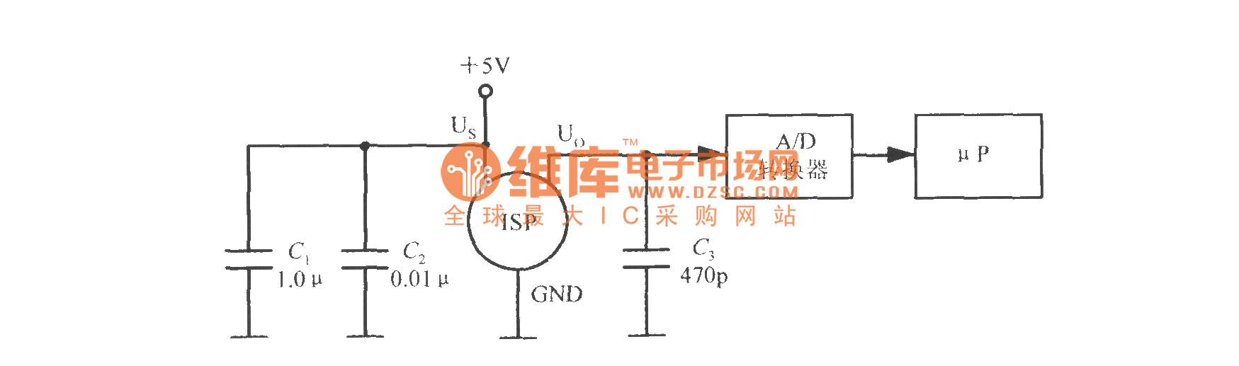 相关元件pdf下载:mpx4100a mpx4100a的典型应用电路如图所示,mpx4100a用来监测管道压力。它采用+5v电源供电,c1和c2为电源退耦电容。c3为输出端的消噪电容。集成硅压力传感器(isp)的输出电压首先通过a/d转换器转换成数字量,再送至微处理器(μp)计算出被测压力值。为了简化电路,还可采用带a/d转换器的单片机,例如motorola公司生产mc68hc05型单片机。
