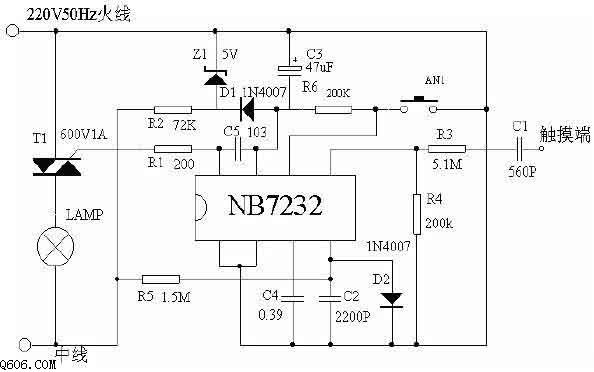 nb7232 触摸(按键)式无级调光(调速)/开关电路。 例1: 例2: 来源:lidy